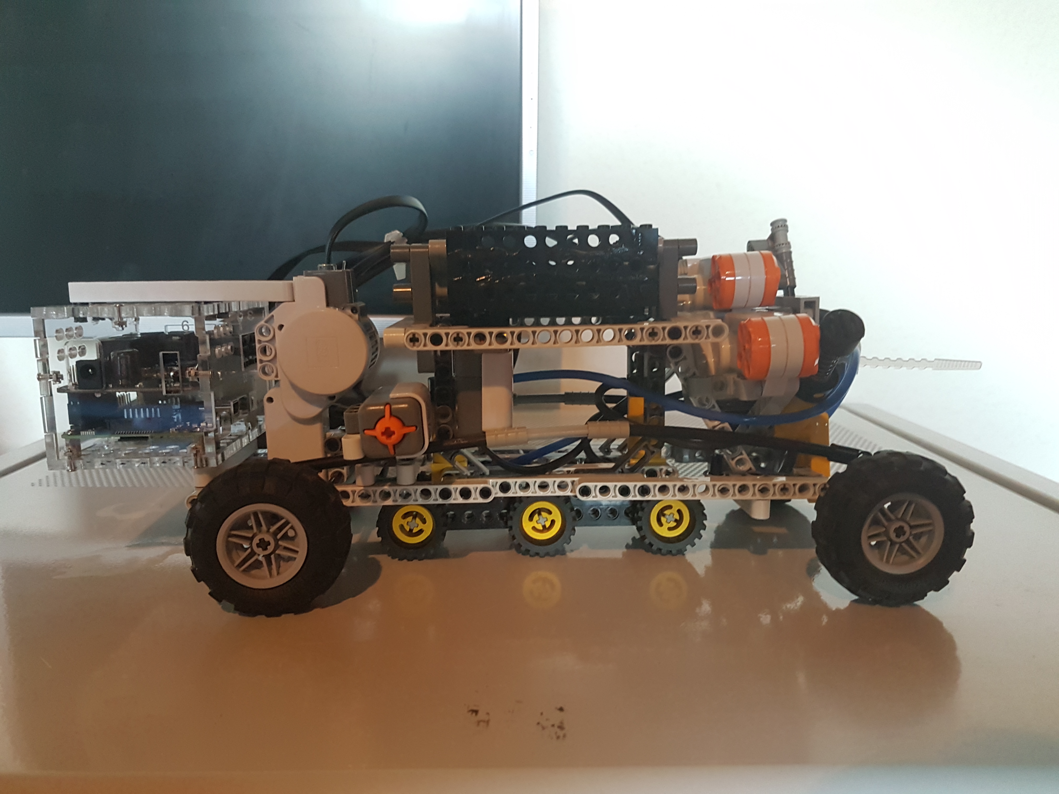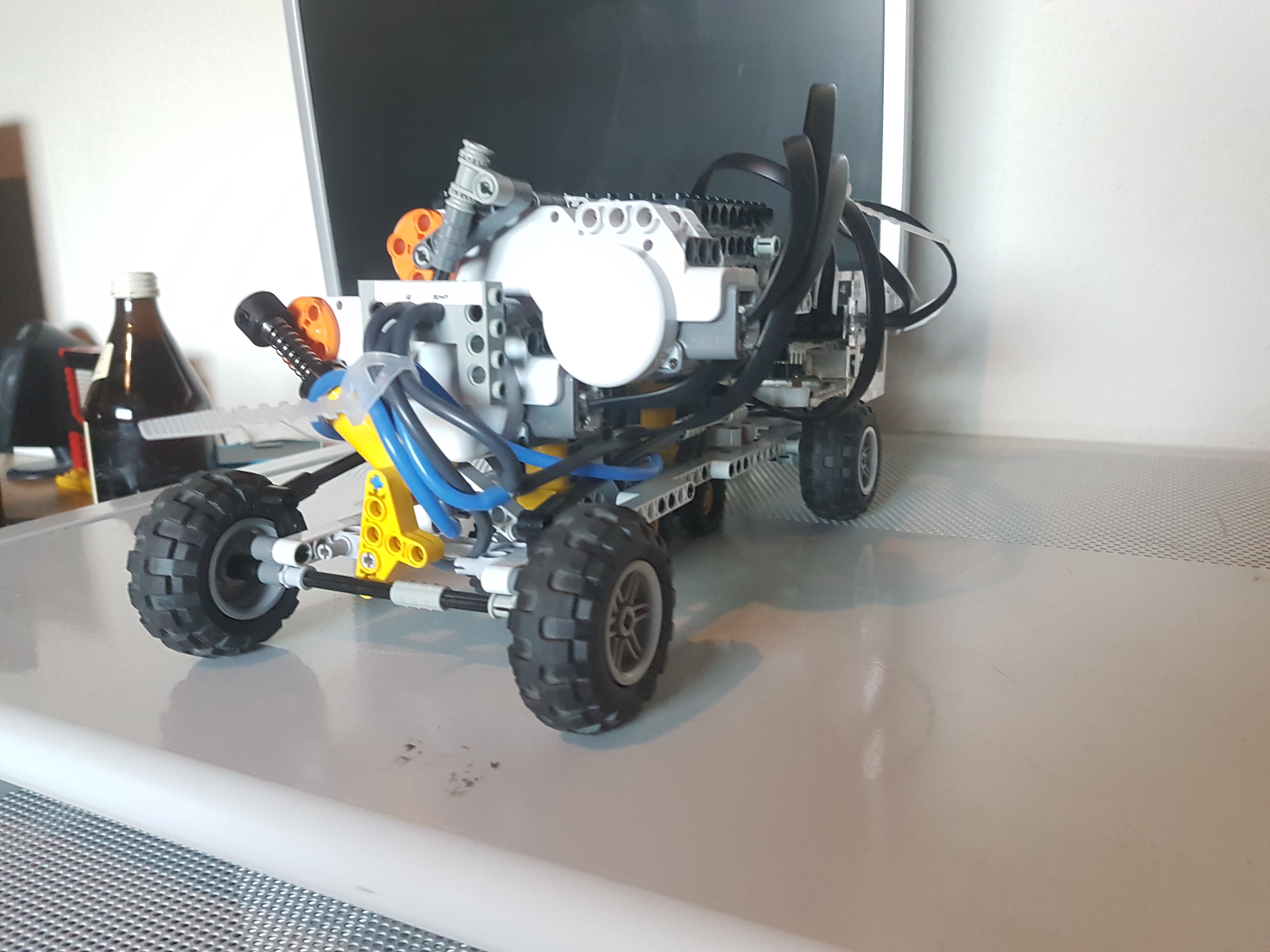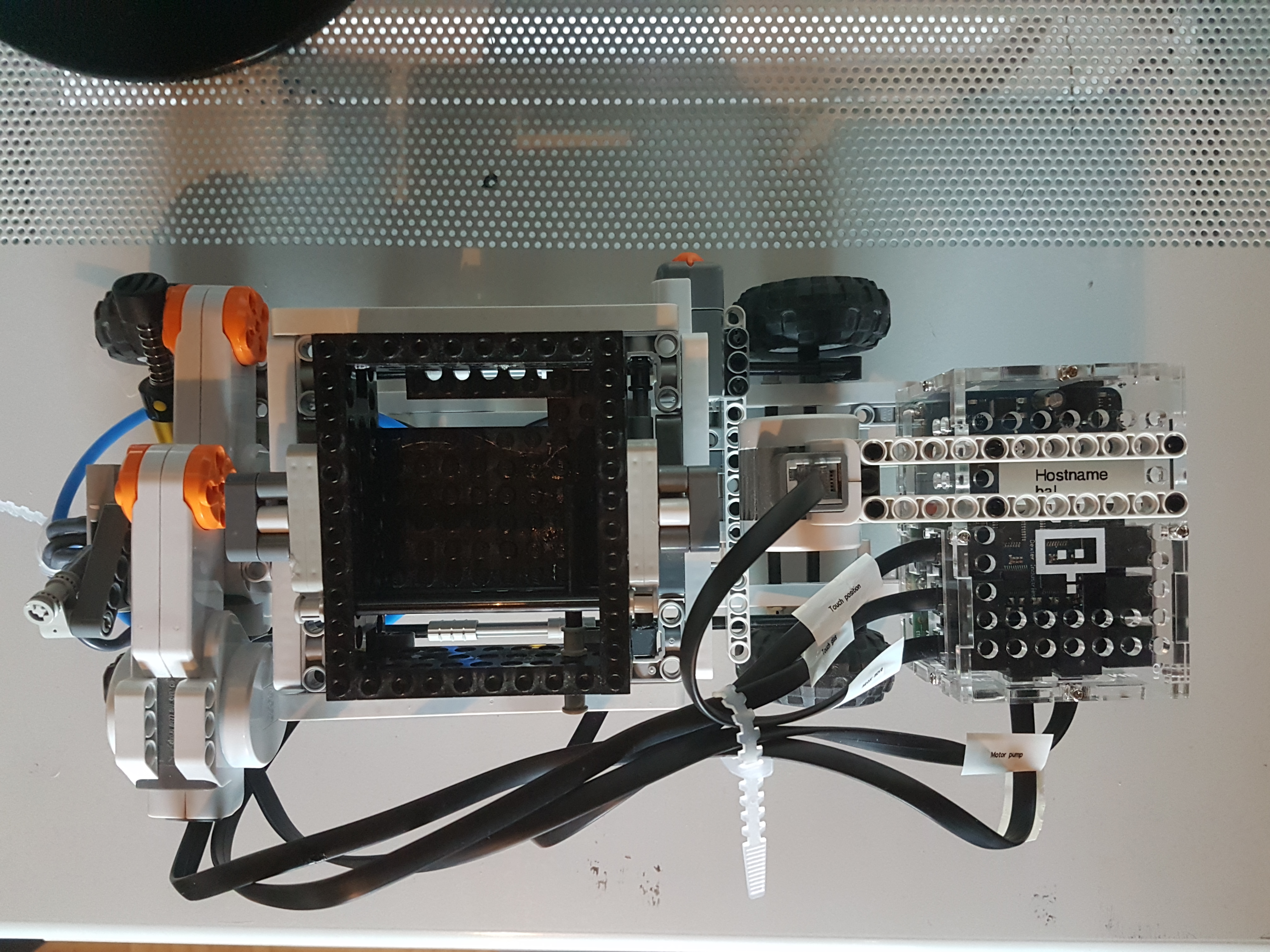 Ein Roboter für die Bar. Der BarRoboter ist aus Lego gebaut. Zur Stuerung und programmierbarkeit der Elektromotoren wird die BrickPi Platine von Dexter Industries verwendet. Diese Platine wird auf einen RaspberryPi 3 Modell B gesteckt. Der Aufbau der Roboters ist auf den Bilder zu sehen, um genügend Kraft aufzubringen, den Getränkespender zu betätigen wird die Lego-Pneumatik verwendet.