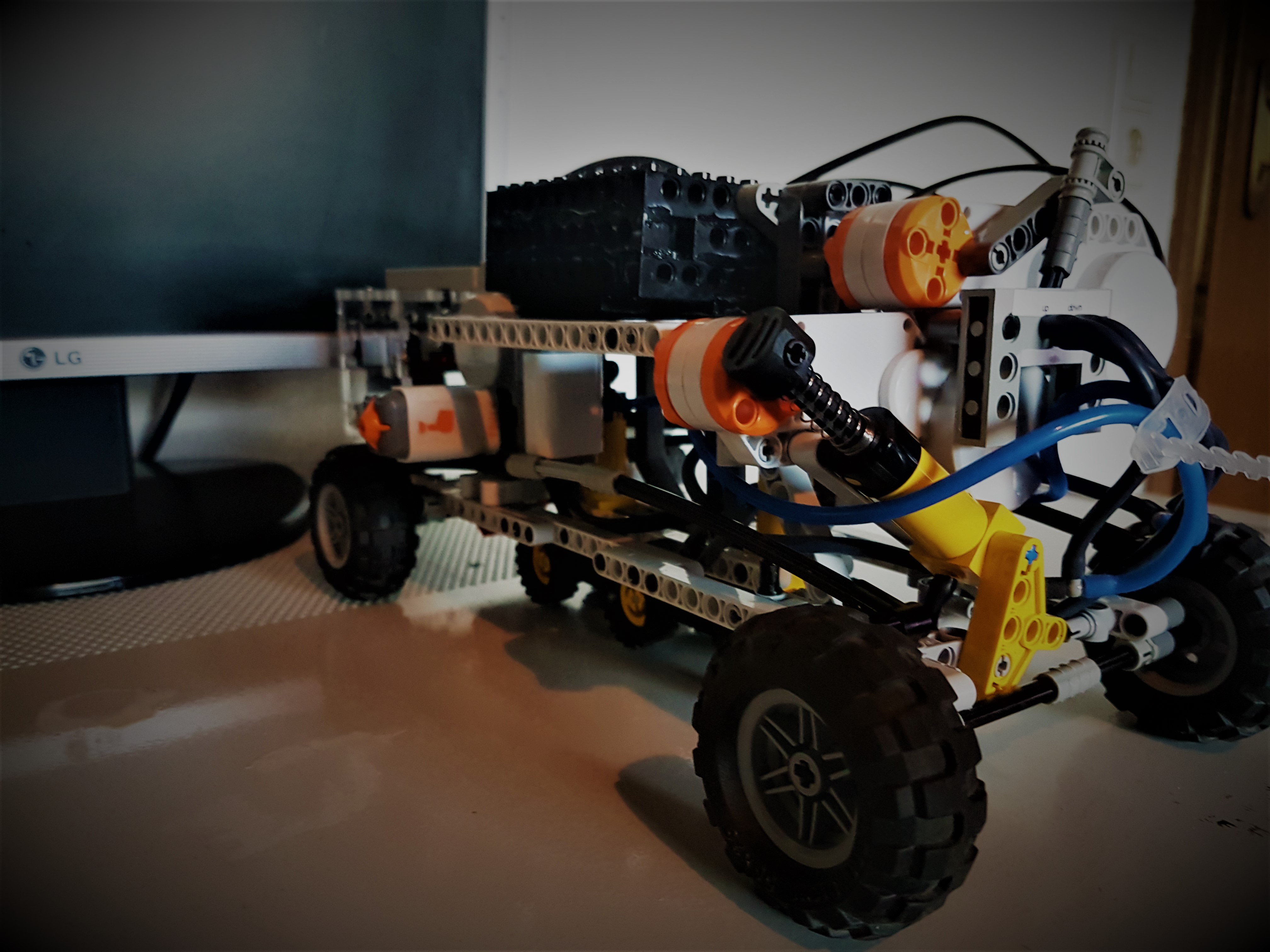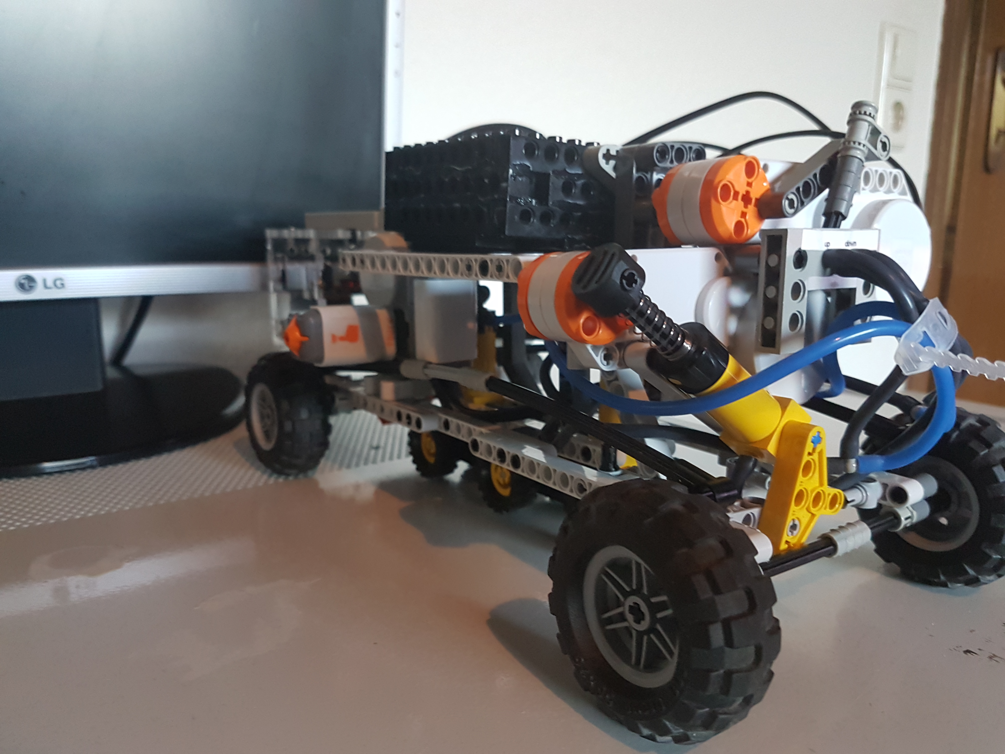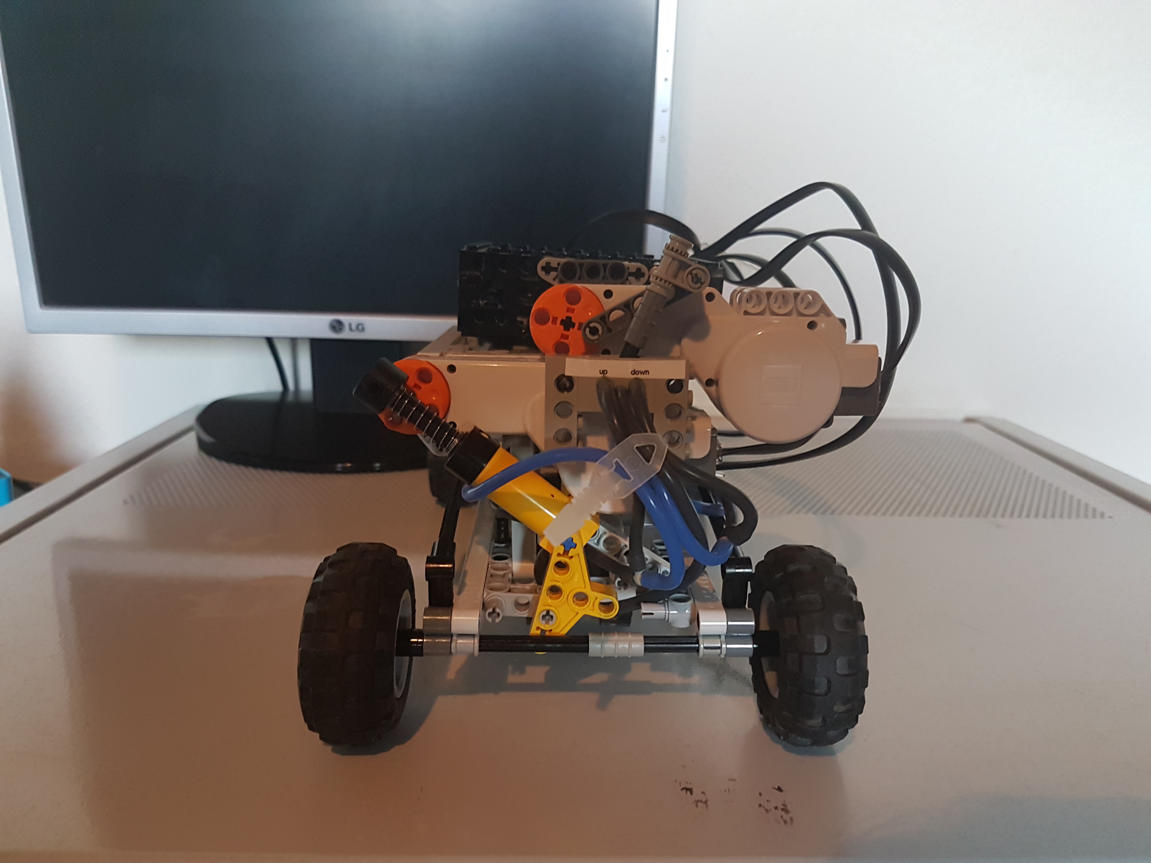 Ein Roboter für die Bar. Der BarRoboter ist aus Lego gebaut. Zur Stuerung und programmierbarkeit der Elektromotoren wird die BrickPi Platine von Dexter Industries verwendet. Diese Platine wird auf einen RaspberryPi 3 Modell B gesteckt. Der Aufbau der Roboters ist auf den Bilder zu sehen, um genügend Kraft aufzubringen, den Getränkespender zu betätigen wird die Lego-Pneumatik verwendet.